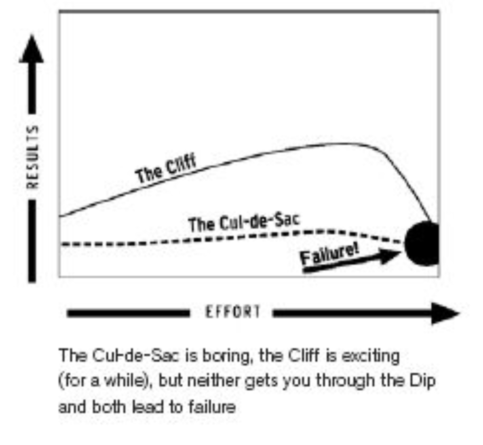 The more cliffs and cul-de-sacs we get entangled with, the less time, energy and attention we will have in getting through the dip.